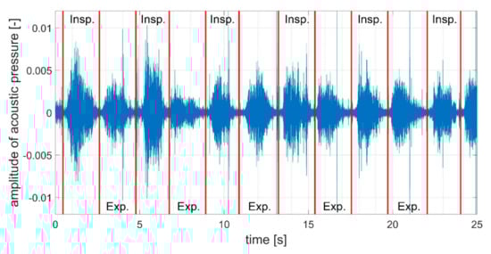 The data processing approach eliminated the high amplitudes sounds so the recording contains mainly the breath sounds. The alternations of inspiratory and expiratory phases are better pronounced and occur when the amplitude of acoustic pressure is minimal (Figure 5).