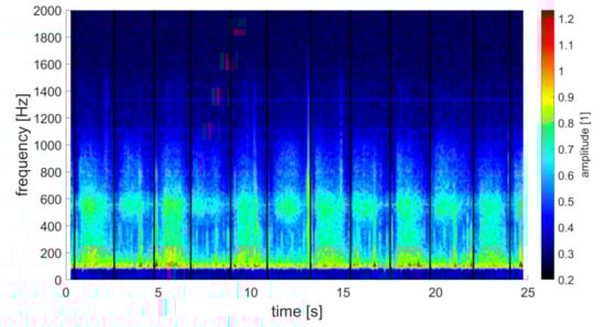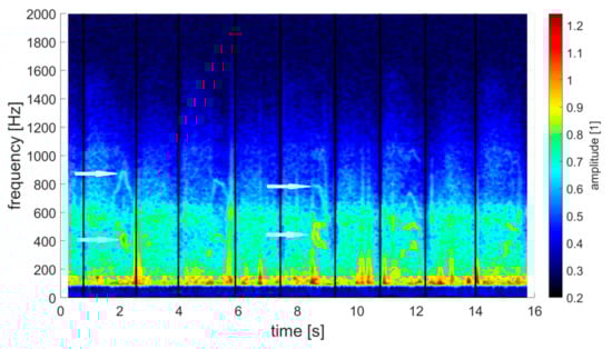 The frequency spectrum of the respiratory sound with black, vertical border lines—Patient No. 1. In the spectrum, there are distinct sound defects caused by the manipulation with record equipment (amplitude distinct areas between 200 Hz–600 Hz with time duration roughly 0.02 s). In the spectrum, two distinct horizontal lines are also obvious—1110 Hz and 1330 Hz. These are most likely an effect of the background noise.