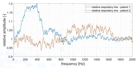 Besides using the respiratory phases to improve the orientation in the frequency spectrum, the average curves of inhalation and exhalation phases can be plotted as a dimensionless ratio relating the amplitudes and frequencies. Such a graph provides a unique piece of inter-individual information on the quality of respiration, and moreover, it is comparable among the patients. When detecting the respiratory phases, the average curves of inhalation and exhalation demonstrate an obvious difference between a healthy participant and a participant with a breathing problem. The important frequency area is between 100–600 Hz where there is an obvious difference between the curves of the healthy participant and the participant with bronchial obstruction. The overall outcome of such a measurement can be used to compare the patients and their breathing patterns while searching for abnormalities using dimensionless curves (Figure 10).