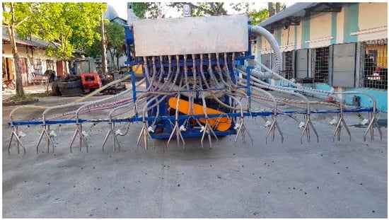 Rice direct seeding is used in paddy cultivation due to its low labor requirements and reduced production cost [,]. Air-assisted direct seeding machines were studied by Chosa et al. [], Loan et al. [], and Furuhata et al. [], showing many advantages and promising working efficiency. These machines can operate across 32 rows powered by a tractor power take-off PTO. The hardness of the soil surface is a factor affecting the depth of sowing. The accuracy of sowing is controlled by a float installed to increase the area of ground–surface contact. A series of seeding machines, such as those of Iseki, Kubota, and Yanmar, have been marketed to meet the needs of sowing seeds in flooded paddy fields. These sowing machines can sow 6–8 rows at the same time in clusters [].
