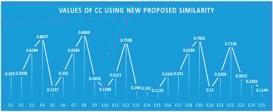 Result: Using Algorithm 1, the results shown in Table 3 can be obtained. In this case, it can be seen that the measures (Equation (7)), (Equation (9)), (Equation (13)), and (Equation (15)) failed to classify sample . However, the proposed similarity measure (Equation (2)), as well as eleven other similarity measures, assigned sample to pattern .