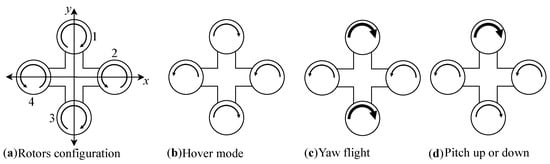 In recent times, drone or unmanned aerial vehicle (UAV) technology has advanced significantly, and it can be applied not only in the military sector but also in civilian areas, such as in search and rescue (SAR) and package shipment, due to its high mobility and large overload maneuver []. Many researchers worldwide are now working to address issues related to UAVs. Herein, we focus on the application, performance, and implementation of machine learning algorithms for controlling UAVs. Even though there are several types of UAVs, such as fixed wings, quadrotors, blimps, helicopters, and ducted fan [], due to its small size, low inertia, maneuverability, and cheap price, the quadrotor had become an industry favorite []. There are several applications of the quadrotor in industries such as film, agriculture, delivery, infrastructure inspection, etc. [,]. A quadrotor or quadcopter (henceforth, the terms UAV, drone, quadcopter, and quadrotor are used interchangeably) is a type of UAV with four rotors designed in a cross configuration with two pairs of opposite rotors rotating in the clockwise direction, whereas the other rotor pair rotates in a counter-clockwise direction to balance the torque []. Figure 1 shows the famous arrangements of the rotors of a quadcopter for flight mode.