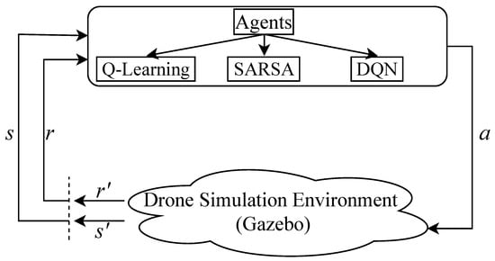 For visualization, interface, and its highly dynamic physics engine, Gazebo is chosen. The first step is to start it. Then the ROS is used to control the drone. Here, OpenAI Gym, which provides the learning agents, is implemented inside the ROS to control the drone. The drone simulator in Gazebo creates the environment and sends several data sensors to give feedback to the agent, and the agent must send actions (Figure 3).