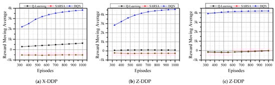 However, DQN showed significant improvement and had no negative moving average reward in any direction. Compared to SARSA, Q-learning has better performance in X-DDP and Y-DDP (Figure 5a,b, respectively). Nevertheless, both algorithms have a negative reward in Z-DDP (Figure 5c). This indicates that DQN has no problem in flying horizontally or vertically, while SARSA and Q-learning are able to fly horizontally but not vertically. As can be seen from the results, the change in reward after the 500th episode is small. Hence, the rest of the evaluations are tested for 500 episodes only, whereas the reward function remains the Euclidean distance.