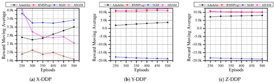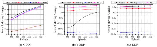 Since DQN with RMSProp optimizer has better rewards, we analyzed the performance of DQN under other optimizers such as Adadelta [], SGD [], and ADAM []. Here, the agent is expected to reach the desired position in only 500 steps. In X-DDP and Z-DDP, the Adadelta optimizer has a better reward (Figure 6a,c). Even though the SGD optimizer showed a good reward in X-DDP, the result in Figure 6b,c shows that SGD has a negative reward. When the agent uses the RMSProp optimizer, it never outperforms other optimizers in any of the directions, whereas the agent shows good performance with the ADAM optimizer in all directions (Figure 6). In Figure 5, there are six results that obtained negative rewards; by dropping Q-learning and SARSA and adopting other optimizers, we reduced that number to three (Figure 6). Then, we replaced the reward function with MSE, which further reduced the negative reward results to two (Figure 7). Although all optimizers show a good sign in flying the quadrotor autonomously, Adam and Adadelta are the best optimizers in both horizontal and vertical desired positions. In addition, we can see from Figure 6 and Figure 7 that the agent is always improving towards a positive reward when with the Adadelta optimizer. This shows the significant role that the optimizers and the reward functions play in flying the drone autonomously.