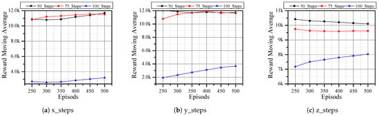 Therefore, using the Adadelta optimizer and MSE reward function, we evaluated the performance of the DQN agent under different steps, that is, the maximum number of steps an agent can take between the initial and desired position. The results in Figure 8 indicate that by limiting the number of steps, the reward increases, which means that the agent performs better. This is due to the fact that the agent is not taking unnecessary actions that might lead to negative rewards. However, reducing the number of steps just to improve reward does not result in better performance, as there are small differences between 50 and 75 steps. In addition, realistic scenarios are not as simple as the simulation cases which can be reached in a few steps.