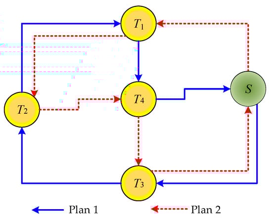 For multi-destination path planning of mobile robots, it is necessary not only to plan the path between two destinations, but also to consider the order of arrival of each destination, consider the global shortest path and time efficiency. The constructed multi-destination path planning scheme is shown in Figure 2. In Figure 2, S is the starting point. Ti (i = 1, 2, 3, 4) represents multiple destination points. Plan 1 and Plan 2 are two plans for multiple global multi-destination sequential arrival sequence planning. According to the global optimal path, the mobile robot can move.