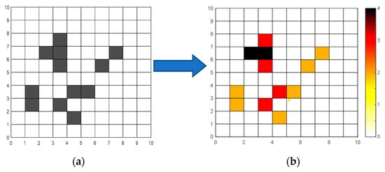 Reconstruction of environmental grid map. (a) Original environment raster map. (b) Environmental grid map with obstacle values.