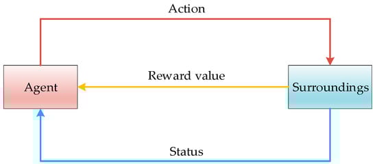 Q-learning is a type of reinforcement learning algorithm. Reinforcement learning is mainly composed of agent, environment, state, action, and reward value []. It is a learning process to achieve a goal through multi-step decision making. The basic structure of reinforcement learning is shown in Figure 6. The Q-learning algorithm is based on the reinforcement learning framework. First, a Q value table is set, and the initial state and reward value are defined. After the agent performs an action, the environment will transform to a new state. In the new state, the environment will give the corresponding reward value. Then, the agent calculates and updates the Q value table according to the new state and the reward of the environment feedback. According to the Q value table, the strategy is selected, and the new action is executed. Finally, through continuous interaction with the environment, the optimal action set is found. The flow of the Q-learning algorithm is shown in Figure 7. The simulation effect is shown in Figure 8.