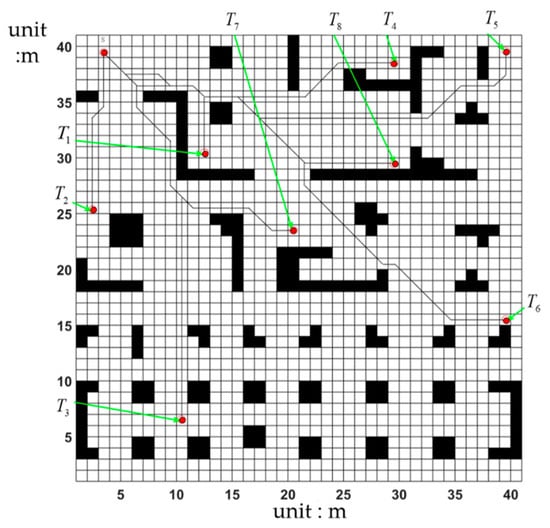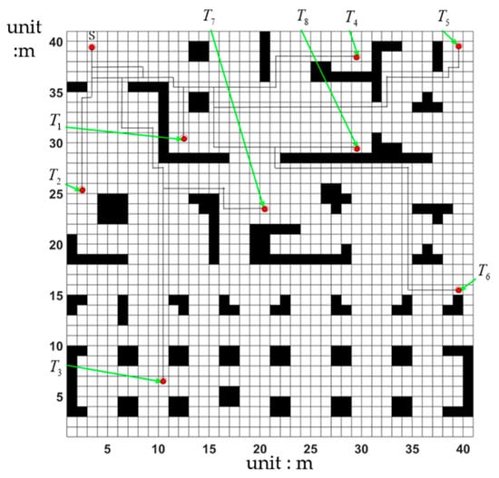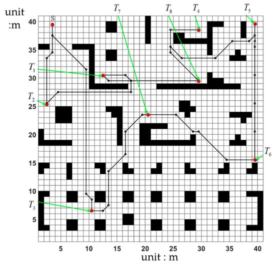 Aiming at verifying the adaptability of the multi-destination path planning algorithm to the environment, the experimental environment is set up in layers. The environment map model is 40 × 40. At the same time, to verify the adaptability, the algorithm can improve the transportation efficiency of mobile robots. This experimental environment has 8 sets of simulation experiments. The number of destinations in each group of experiments gradually increased. The length of the moving path obtained by the experiment is shown in Figure 11. The comparison of the planned routes for the eight destinations is shown in Figure 12 and Figure 13. In the two figures, point S represents the starting point of the mobile robot. Point set Ti (i = 1, 2, 3, 4, 5, 6, 7, 8) represents the destination of transportation. The black grid area represents 1 obstacle. The solid line represents the planning route of the mobile robot.