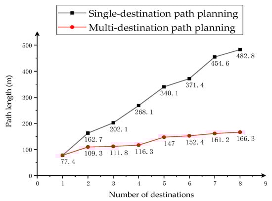 It can be seen from Figure 12 and Figure 13 that single-destination path planning causes the mobile robot to return to the starting point multiple times. It reduces the efficiency of the mobile robot. Figure 13 shows the path of multi-destination planning in this article. The path of multi-destination planning can reach all destinations at one time. It reduces the number and time of calculation paths. From the path length comparison chart in Figure 11, as the number of destinations increases, the path length planned by the single-destination path planning algorithm increases rapidly. However, the path length planned by the multi-destination path planning algorithm designed in this article grows smoothly. Compared with the ground path planning algorithm, the average length of this article is reduced by 22%. It improves the work efficiency of the mobile robot.