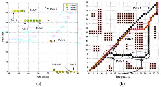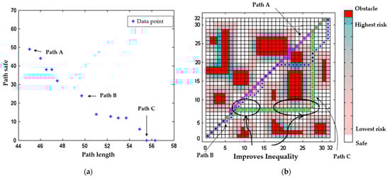 (a) Pareto front obtained using the MD-Q-learning algorithm based on passing through the fewest obstacles. (b) Use of the obstacle arrangement and three paths based on the MD-Q-learning algorithm that passes through the fewest obstacles.