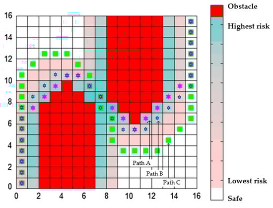 To test the ability of the algorithm to approach the best Pareto front, a benchmark test is added. As shown in Figure 16, there are 88 obstacle units on a 16 × 16 obstacle grid. This test was also considered in earlier path planning studies.