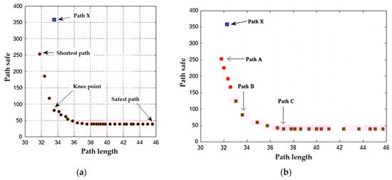 This experiment is performed using 50 populations and repeating 50 times. Similarly, the minimum and maximum values of the local search operation are equal to 10 and 50, respectively. As shown in Figure 16, in this case, the CSD based MD-Q-learning algorithm obtained the shortest and smoothest path (solutions A and C, respectively). Solution B shows an intermediate path. It seems that the middle path chosen makes a good compromise between the two extreme solutions. Figure 17b shows the best Pareto front of the CSD based MD-Q-learning algorithm. The obtained Pareto front shows that the minimum path length solution and several other solutions are superior to the earlier reported solutions. The algorithm in this paper is heuristic, so the failed Pareto solution will be obtained (represented by “path X” in Figure 17b). The main reason is the limitation of minimum path length and some safety factors.