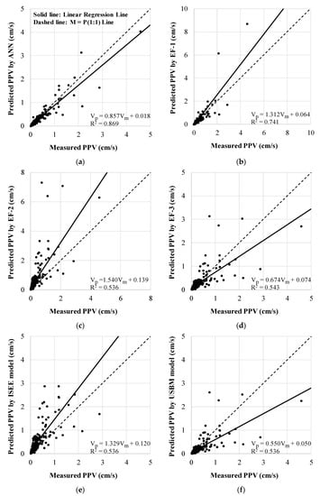 Here, and are the i-th measured and predicted values, respectively, and n is the total number of test datasets. Table 7 summarizes the performances of the eight prediction models on the predicted PPVs. The developed ANN model achieved the lowest MAE of 0.064 cm/s, RMSE of 0.161 cm/s, and MAPE of 23.2%. These results were approximately 30%, 56%, and 11% lower than those from EF-1, which is currently the most commonly used method to predict PPVs when designing blasting patterns for construction. However, the EF-2 deduced the highest MAE of 0.305 cm/s and RMSE of 0.731 cm/s.