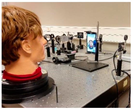 The ambient light sensor included in the device itself can be used to calibrate the system for each face and obtain the coefficient k′. The light that reaches the light sensor E0f is initially measured by situating the sensor in proximity to the subject’s eyes (Figure 2 left), facing forwards. Next, the device is restored to its natural orientation, facing the user at a comfortable distance (Figure 2 right) and a calibration illuminance, E0P is determined from the CCD of the device camera (Figure 2 right). The average value Ym is obtained from the area around the eyes in the image of the face captured by the front camera of the device. The exposure system of the camera adjusts the exposure time, ISO value, and the f/# automatically when taking the image. With this calibration approach, using the light sensor to calibrate the camera images, all the values in Equation (4) are known except the constant k′ which is computed and subsequently can be applied to any other image captured when the device is used under any other illumination conditions for the same face–device combination.