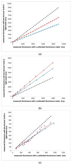 Calibration of the built-in light sensor showed an underestimation of about 50% when a homogeneous illumination source was used that extended over a solid angle of 2π sr (Figure 4a) and an overestimation of about 80% when the illuminant was a small angle source in an otherwise dark field (Figure 4b). These inconsistencies between the device light sensor and the lux meter measurements reflect a combination of gain/sensitivity of the sensors as well as the angular selectivity of the sensors, which depend on their optical design. Sensors in smartphones have been reported to assess light levels over approximately 70° [], being maximal in the normal direction to the detector and decreasing with eccentricity []. Such angular selectivity is well designed to assess the visually relevant light levels as long as the sensor is located at or near the eye and directed away from the face.