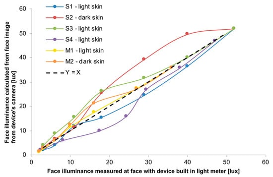 where the constant k′ includes all values that are considered constant for a particular device and face combination. The remaining values in Equation (4) are usually chosen automatically by the camera’s auto-exposure system based on the scene. Of all these values, the one that varies the most in response to a change in lighting conditions is the luma (grey level) of the pixels in the area in the image, which includes the face. Because the value k′ for each device and face combination is unknown, a calibration was necessary for each device/subject pairing to convert camera pixel luma values (Ym) to face illuminance (Ef).