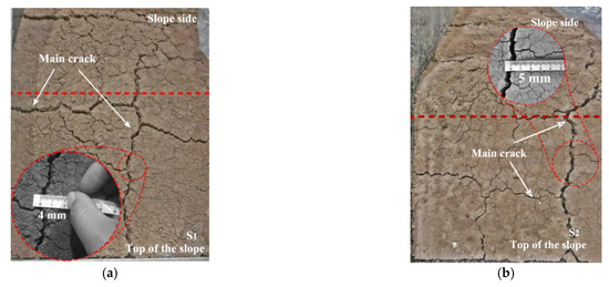 After four freeze-thaw cycles, the development of cracks at the top of the , and slope models is shown in Figure 6. The maximum width of cracks on the slope top was 4 mm, that of the slope was 5 mm, and that of the slope was 6 mm. Lu et al. [24] divided the development of cracks in expansive soil into three stages: crack initiation, crack propagation and crack stabilization, and attributed the formation of cracks to moisture evaporation and ice sublimation. However, in this test, the slope was in a closed system, and there was no moisture exchange with the outside. Figure 7 shows that there was obvious moisture migration to the slope surface during the freeze-thaw cycle. For a closed system, moisture migration to the surface of the slope model means that the moisture content in the slope decreases, and the expansive soil particles shrink rapidly due to moisture loss. This will lead to an increase in pores in the slope model and will produce fine cracks, which will affect the structure and stability of the slope.