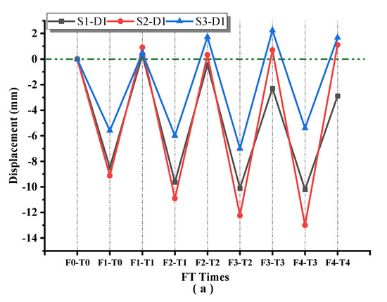 Figure 11 shows the change in slope displacement during freeze-thaw cycles. Under one freeze-thaw cycle, the displacement of the , and slope models decreased with temperature in the freezing process and increased with temperature in the thawing process, which is called “freeze shrinkage and thaw expansion”. The overall trend of the slope was towards the free face and tended to be stable after the second freeze-thaw cycle. After the displacement attained stability, the maximum changes in the slope top displacement of the , and slope models were 12.66, 12.24 and 6.73 mm, respectively. The vertical displacement of the slope decreased with increasing slope ratio.