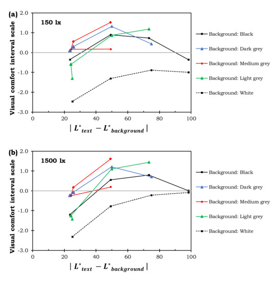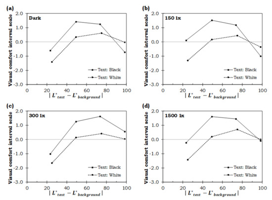 The six sets of visual comfort experimental data under Dark, 150 lx, 300 lx, 1500 lx, 3000 lx, and 15,000 lx are used to analyze and compare to each other to explore their impacts. The low Pearson correlation coefficients between the visual comfort interval scale below 150 lx and above 3000 lx reveal that the observers apparently preferred different text-background combinations under extremely low and high illuminance levels. When the observers compare the text-background combination with the white and black background, the perception of visual comfort increases by the combination of a white background with the ambient illuminance level getting higher. Regardless of the illuminance level, the observers almost prefer the background combined with black text to white text. As a result, the observers’ evaluation below 1500 lx is similar to the others. However, the observers’ response of 3000 lx is close to that of 15,000 lx. Additionally, the background-text lightness combined with the positive contrast leads to better visual comfort under the six lighting conditions, especially where the background is medium gray, light gray, and white.