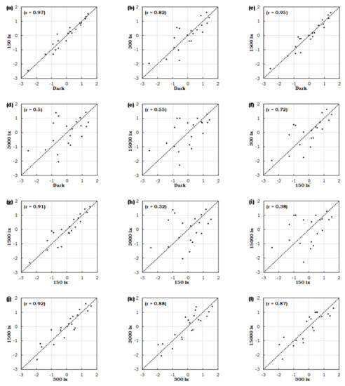 Correlation r between different combinations of ambient illuminance settings (Dark, 150 lx, 300 lx, 1500 lx 3000 lx, and 15,000 lx).