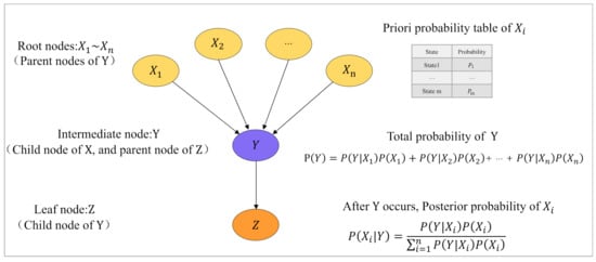 BNs were introduced by Dr. Judea Pearl. A BN captures conditional probability relationships based on the Bayesian theorem, and connects the uncertainty relationships among different events by a directed acyclic graph, thus yielding a causal probability network that contains the transmission paths of events. In Figure 2, a sample BN is shown, where three layers of nodes are connected with directed acyclic arrows. The nodes are considered the model variables, and relationships between variables are represented by directed acyclic arrows. Any sub-node of a given node is called a child node, and the given node is the parent node. Root nodes have no links directed toward them (i.e., they do not have parent nodes), and represent basic events whose probabilities are assigned as prior probabilities. These probabilities are obtained from standard sources of failure data or based on expert elicitation in the case of unavailable failure data. Nodes with no child nodes are called leaf nodes, and are quantified using a conditional probability table (CPT). Both intermediate and leaf nodes are quantified using a CPT, considering the causal dependence between them [].