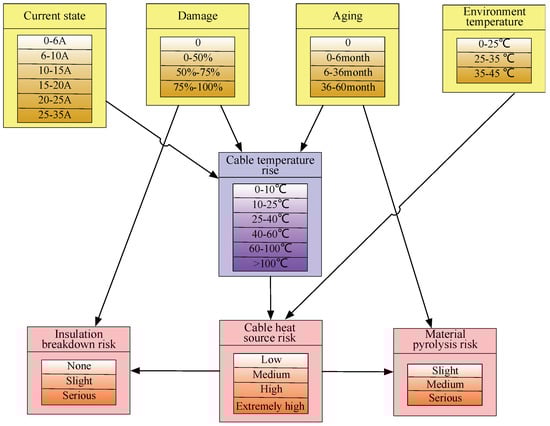 During the early fire risk evolution, regardless of external factors, the overcurrent is the main culprit of overheating, increasing the cable temperature. In addition, cable aging, mechanical damage, and high ambient temperature are also important factors that increase the cable temperature. In particular, the cable insulation material, PVC, suffers from thermal aging, which irreversibly increases the cable insulation breakdown risk []. In addition, the loss of the plasticizer causes the formation of voids in the material, which reduces the insulation breakdown strength []. Based on the above considerations, the risk transmission process of overload-induced cable fires in this study is presented in Figure 1. In the cable fire formation stage, electric sparks, high-temperature heat sources, and flammable substances are caused by three risk factors, as shown in Figure 1.