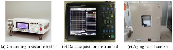To explore the influence of mechanical damage, aging, and current on the cable temperature increase, an experiment was conducted to test the internal wiring single-core flexible conductor unshielded cable (60227iec 05 BV) with a cross-sectional area of 0.75 mm2. The equipment used in this experiment is shown in Figure 5. In particular, a grounding resistance tester, TSO6210 (Figure 5a), was used for providing a stable and large constant current. The temperature of the cable surface was measured using a 0.32 mm T-type thermocouple and recorded using an LR8431-30 data acquisition instrument (Figure 5b). A thermal aging test chamber (Figure 5c) provided a constant-temperature aging environment for aging cable samples.