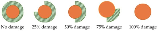 Mechanical damage was modeled as partial insulation that affected heat dissipation, directly exposing the high-temperature core and causing cable overheating. Cable damage was quantified by the angle of the cable local damage; five examples that illustrate different exposed ratios are shown in Figure 6.