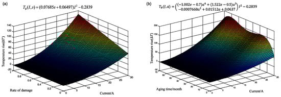where is the balanced temperature rise under specific current, damage, and aging conditions; is the current, is the damage degree, ; and is the aging time (in months).