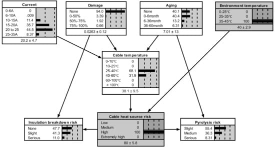 Many studies have addressed the ignition and combustion mechanisms of cable fires, by a large number of experimental analyses. For instance, Babrauskas [,] and Zhang [], investigated the mechanisms of cable fires caused by arc faults, overheating of cable cores, and external heating. Courty [] and Fisher [], revealed the ignition mechanisms and failure criteria of cable fires by performing cable fire characterization experiments. Shea [] investigated cable fires caused by cable looseness or corrosion, high resistance connection, and wire insulation moisture absorption. Xie [], Shu [], and Zhang [], studied the influence of polyvinyl chloride (PVC) cable aging on the fire risk. The above studies revealed that the mechanisms of cable fires were associated with intrinsic factors. However, the occurrence of cable fires is generally attributed to a complex combination of factors. Moreover, conventional methods cannot simultaneously predict the occurrence probability and the consequences of cable fires. In this sense, a cable risk analysis model should be implemented, for incorporating the impact of multi-factor coupling and for quantifying the occurrence probability and the severity of fire consequences.