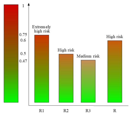 Based on the risk-establishing BN, the probabilities of different risk factors corresponding to each risk state were obtained. Then, the risk indices of risk factors were obtained from Equation (15), and the overall risk index was computed using Equation (16).