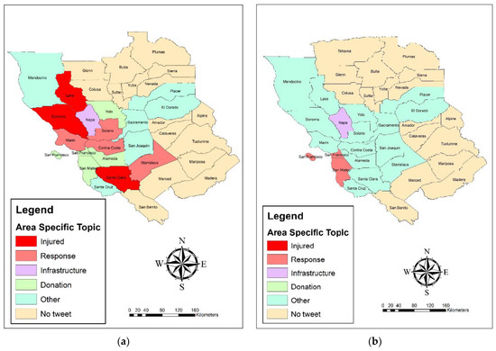 More attention is being paid to integrating the spatial and content data of social networks. LQ could offer extra perspectives by integrating spatial and content data that go beyond the common point pattern analysis and simple mapping. In this study, LQ was used for identifying area-specific topics. Based on the results of LQ at the county scale in all algorithms, Napa, as the center of the earthquake, was considered as having the greatest concentration of damage-related messages in all algorithms.