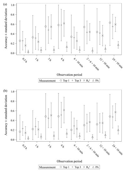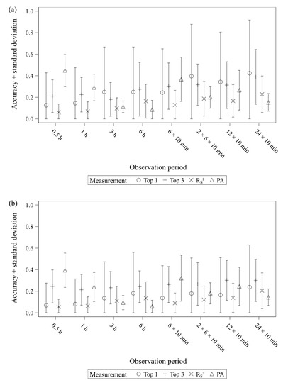 Moreover, the comparison between the observation periods of the same kind and length produced mostly low accuracy scores. Therefore, the starting point of the observation can also affect the results considerably, which was demonstrated by Hämäläinen et al. [24] as well. This can complicate comparability between studies if animals are observed at different times or if animals differ in their daily routine because of variations in, for example, feeding schedules. Thus, sampling method, observation length as well as observation time should be carefully considered.