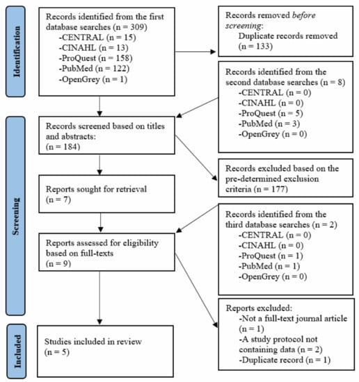 Cochrane Central Register of Controlled Trials (CENTRAL), CINAHL, ProQuest, PubMed, and OpenGrey databases were searched first on 10 April 2021 for all dates without applying a time limitation, and last on 22 September 2021. Additionally, reference lists of eligible studies were screened in order to avoid publication bias caused by grey literature as an addition to the OpenGrey database search. Database search histories are shown in the Supplementary Table S2.