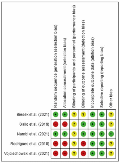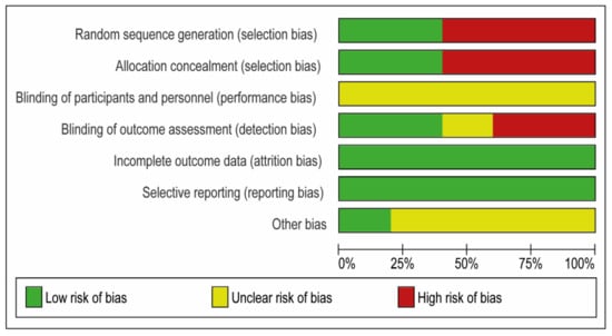 - Higgins, J.P.T.; Altman, D.G.; Gøtzsche, P.C.; Jüni, P.; Moher, D.; Oxman, A.D.; Savović, J.; Schulz, K.F.; Weeks, L.; Sterne, J.A.C. The Cochrane Collaboration’s tool for assessing risk of bias in randomised trials. BMJ 2011, 343, d5928. [Google Scholar] [CrossRef] [PubMed]
