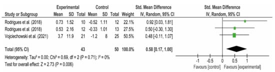 In the meta-analyses, statistical heterogeneity was calculated via chi-squared (χ2, or Chi2) statistics, and the level of the statistical heterogeneity was assessed by I2 statistics, which defines the percentage ratio of the variability in effect calculations due to heterogeneity rather than chance []. The I2 values were classified as low (25%), moderate (50%), and high (75%) []. A more conservative random effect (RE) model, 95% confidence interval, continuous data, and inverse variance features of a meta-analysis were applied during the quantitative analyses []. The RE model was defined as a better tool that accounts for statistical and methodological heterogeneities by a recent meta-analytic study [].