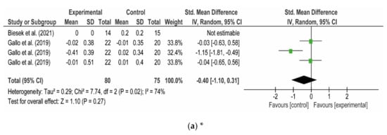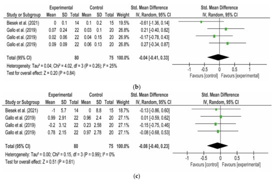 The effects of twelve weeks of exergames on the medial gastrocnemius muscle architecture in community-dwelling older women: (a) fascicle length; (b) muscle thickness; (c) pennation angle. * In this meta-analysis, the given data in the study of Biesek et al. [] was not calculable by RevMan []. Note: The first, second, and third Gallo et al. in each forest plot respectively represent the measurements taken from 20%, 30%, and 40% distances in the relevant study []. These forest plots were created via RevMan [].