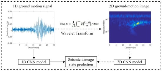 The 2D CNN-based seismic damage assessment used as a reference is briefly summarized before the 1D CNN approach is presented. Figure 1 shows the pipeline of the 2D CNN approach (dash arrows) as summarized from the previous studies [,,]. The 1D GMRs had to be transformed into 2D GMR images through an encoding technique (e.g., WT encoding) before they were inputted into the 2D CNN model for post-earthquake damage assessment. As a widely used image encoding technique in GMR classification, WT encoding achieved the highest prediction accuracy among three image encoding techniques [] and was thus used to encode GMR images in this study via the toolbox developed by []. In contrast, the 1D CNN approach (solid arrows), in Figure 1, directly used the recorded GMRs in the 1D CNN model and predicted their resultant damage states. The heavy preprocessing of WTs in the 2D CNN approach was avoided in the 1D CNN approach. Therefore, the 1D CNN approach would be preferred if it could maintain a comparable or higher prediction accuracy, as compared to the 2D CNN approach.