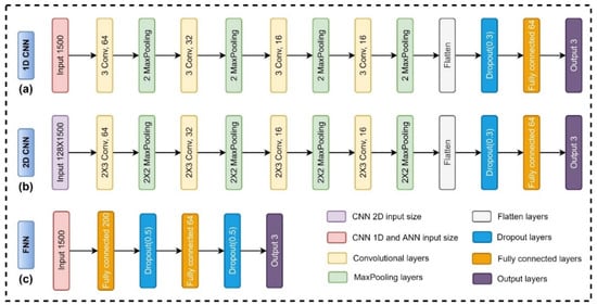 The architectures of three neural network models: (a) the 1D CNN model; (b) the 2D CNN model; and (c) the FNN model.