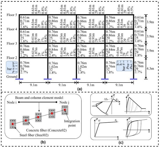 The symbol “ρ” means the reinforcement ratio of the columns, and the symbols “ρbot” and “ρtop” are the bottom and top reinforcement ratios of the beams. In this study, all the columns were fixed at the base since their support conditions had little effect on seismic responses. Figure 4b represents the fiber-distributed plasticity element to simulate the nonlinearity of the beams and the columns of the frame. Each structural element consisted of five integration points. The material characteristics of concrete (with a nominal compressive strength of 34.5 MPa) and steel (with an expected yield strength of 462 MPa) were captured by the Concrete02 and Steel02 material models in OpenSEES, respectively. The stress–strain relationships (left) and the hysteretic behavior (right) of Concrete02 (top) and Steel02 (bottom) are found in Figure 4c. Additional details regarding these two materials were referenced in [,].