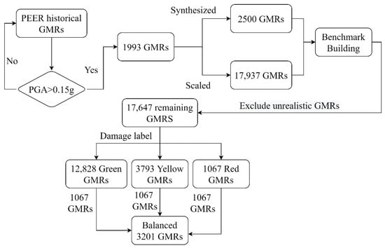 A total of 1993 worldwide horizontal historical GMRs with PGAs higher than 0.15 g (g = 9.81 m/s2) were selected from the PEER GMR database (https://ngawest2.berkeley.edu/, accessed on 5 April 2021) for the NLTHA of the benchmark building. However, due to the stringent seismic design of the building, only 7 out of the 1993 historical GMRs yielded a red tag, given the NLTHA results. A simple way to obtain sufficient strong GMRs was to uniformly scale up the historical GMRs by a scaling factor []. However, scaling factors, along with structural properties, GMR intensity, and types of seismic responses, can cause biased NLTHA results [,,]. In the engineering seismology community, common scaling factors vary from 1 to 10 or more []. An alternative way is to synthesize GMRs based on historical GMRs even though it takes more computing time and resources. To obtain enough red tag GMRs and limit the bias introduced by scaling factors, the 1993 historical GMRs were scaled from 2 to 10 with an increment step of 1. Thus, 17,937 extra GMRs were obtained. Meanwhile, 2500 synthesized GMRs were generated, and they were spectrum- and energy-compatible with the historical GMRs, based on an algorithm developed in []. Therefore, 22,430 GMRs were obtained and inputted into the building model for NLTHA. To further limit the bias introduced by the potentially excessive scaling of historical GMRs, the MIDRs in the 22,430 GMRs were examined, and the GMRs resulting in MIDRs > 0.12 were excluded because the perimeter frame would have collapsed with an MIDR larger than 0.12, indicating it is impossible for the numerical model to have a converged solution due to instability. An examination of the excluded GMRs showed that most were scaled up with a factor over 8, which affirmed that the excessively scaled GMRs were removed. Among the remaining 17,647 GMRs, only 1067 GMRs were labeled with red tags. To form a balanced training dataset and to ensure that the performance of the neural network models was not biased by the class that had the most training GMR samples, 1067 GMRs were randomly selected from the green and yellow classes. Finally, a balanced dataset composed of 3201 GMRs was collected to train the neural network models where each green, yellow, and red class had 1067 GMRs, respectively. The process of GMR selection is shown in Figure 5.