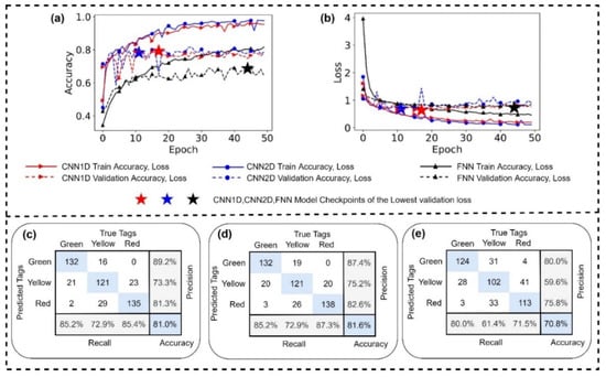 The training, validation, and test results of the three neural network models: (a) the accuracy histories on the training and validation sets; (b) the loss histories on the training and validation sets; (c) the test confusion matrix on the test set of 1D CNN model; (d) the test confusion matrix on the test set of 2D CNN model; and (e) the test confusion matrix on the test set of FNN model.