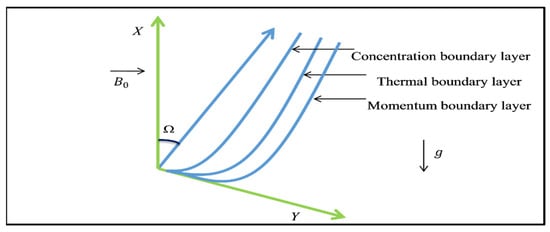 This section analyzes the flow behavior of Williamson nanofluid on an inclined surface. The angle is considered among stretching sheet and vertical direction. A further sheet stretched with the rate causes the flow of fluid. Heat generation or absorption impacts are under consideration. The concentration and wall temperature are taken as , , respectively, while denotes the velocity on the wall. Moreover, at approaches to infinity , exhibits temperature and nanoparticles concentration, as shown in Figure 1. Additionally, Figure 1 presents the flow model and coordinate scheme. For Williamson fluid, the expression for Cauchy stress tensor is given as []: