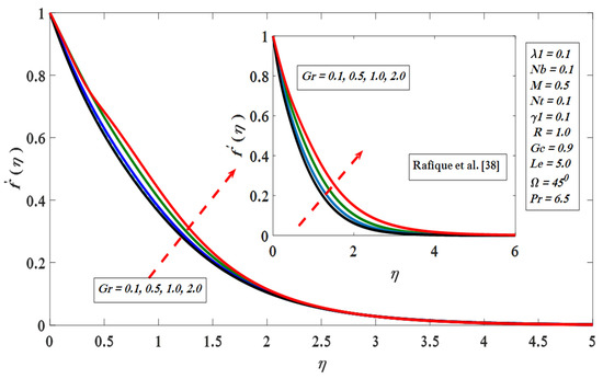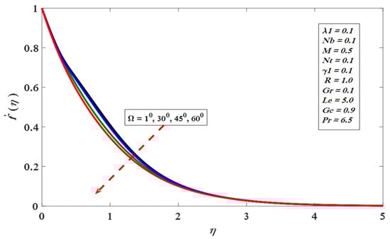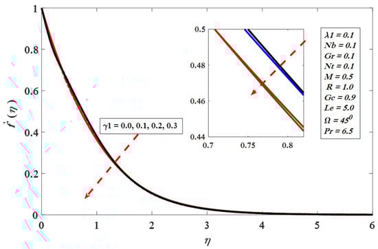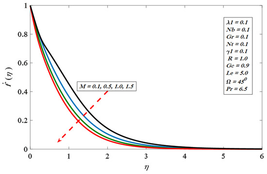 Figure 2 exhibits that dimensionless velocity is moderated by resistive force, which is produced by the magnetic effect. It is verified that the numerical computations of for and , which are displayed in Figure 3 and Figure 4, show a good approval with the reported earlier study by Rafique et al. []. It is true because the buoyancy effect increases the speed of fluid flow. Figure 5 reveals the inclination impact on the velocity. It is clear that decreases on growing angle, and the recovered trend is in reasonable agreement with finding by Ramesh et al. []. Physically, when , the buoyancy force effect declines; as a result, velocity also decreases. Figure 6 demonstrates that the Williamson factor decreases the velocity field because the boundary layer thickness decreases with growth in non-Newtonian Williamson parameter.