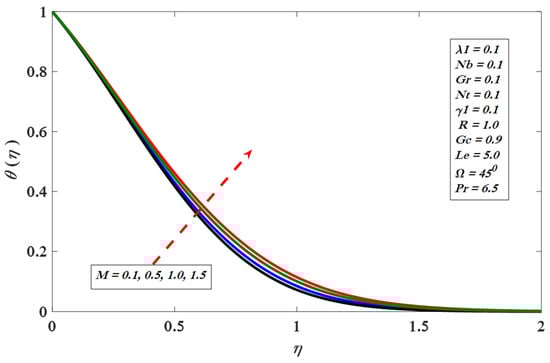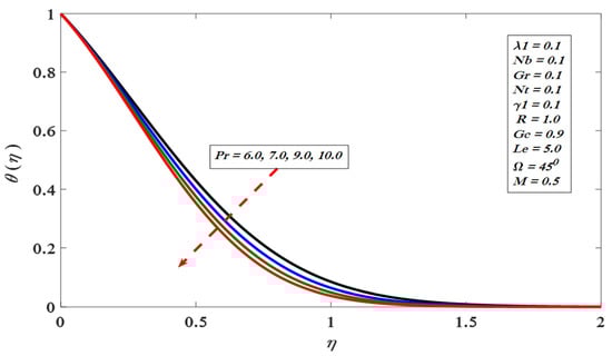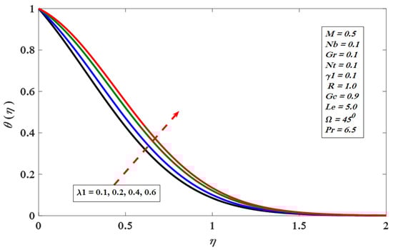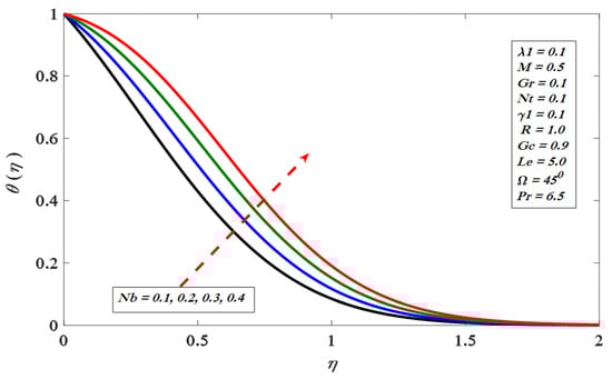 The magnetic field increases the temperature profile in Figure 7. Figure 8 portrays temperature increases with respect to , i.e., heat generation or absorption factor generates heat in the flow field and temperature enhances with in the thermal boundary layer. Figure 9 shows an enhancement in basis the viscosity enrichment and descent in thickness of thermal boundary layer, finally temperature decreases. The irregular diffusion of particles warms up the boundary layer, because of which the temperature of the fluid increases as shown in Figure 10. Figure 11 exhibits temperature increases against thermophoretic effects. Increasing values of thermophoresis imply a higher shear gradient and temperature difference. Therefore, changes in the thermophoresis parameter help us to improve the temperature difference across the boundary layer.