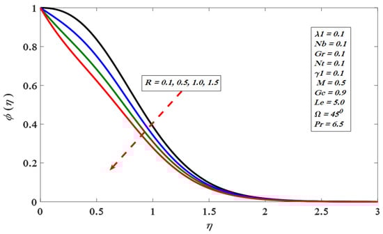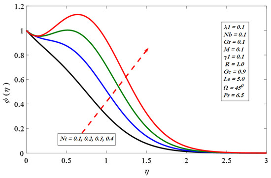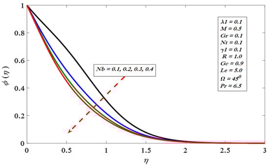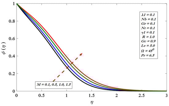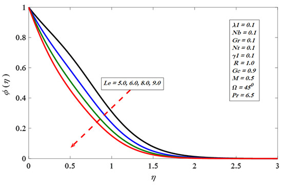 Figure 12 demonstrates that the concentration outline increases as we strengthen the magnetic field. A similar impact on the temperature profile against the magnetic parameter was observed by Ullah et al. []. Further, Figure 13 reveals that displays a converse relation with (chemical reaction). It is notable that, with change in chemical reaction, Salleh et al.’s [] results have been recovered. Figure 14 displays the boundary layer viscosity changes by enhancing Lewis number. A larger Lewis number is related to a lower and vice versa. The boundary layer thickness decreases when increases, which causes a decline in concentration distribution (see Figure 15). Figure 16 presents the thermophoresis influence on , showing direct correspondence with , because nanoparticle concentration is a strong function of , due to which was significantly affected. Further, large values of indicate that stronger increases the thermal conductivity of nanoparticles adjacent to the wall.