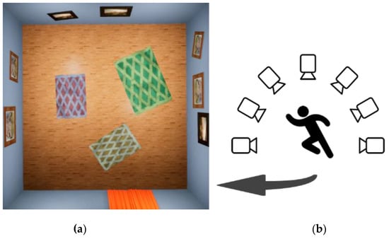 Visual representation of simulation room (a) and camera system for digital human (b).