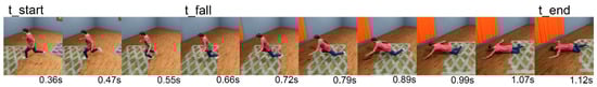 The slides of the registration process for synthetic data simulation are shown in Figure 4. In the process of digital human random motion at some arbitrary moment, the action is triggered at t_start time, which leads to a “fainting” after a t_fall time. From the moment the trigger t_start is activated, the automatic system begins a comprehensive data collection. At t_fall, the physical model of a person is activated, which corresponds to the simulation of a sudden loss of consciousness in a person. The animation contribution to the movement of the joints tends to go to zero, and only the simulation of the capsule model remains—the person continues to fall in the direction of inertia of the last skeletal pose until the moment t_end, when the physical model is fully balanced. In addition, we can capture the digital human during his motion in the behaviour process, which provides non-fall images.